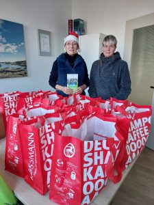 Die Weihnachtstüten enthalten Körperpflegemittel, Süßigkeiten, Kaffee und eine kleine Überraschung. Bedacht werden Seniorinnen und Senioren, die in der Regel nur noch das Taschengeld nach den sozialrechtlichen Bestimmungen von ihrer Rente behalten dürfen.